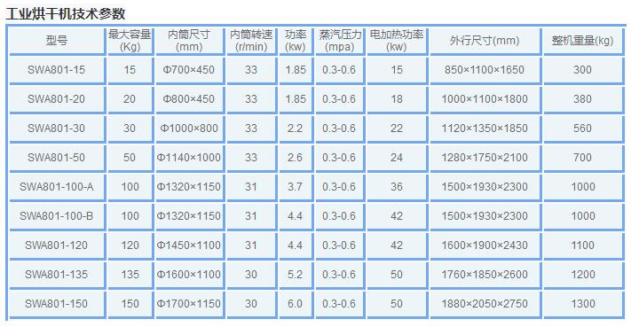 工业烘干机特点 1. 汉庭洗涤机械生产的SWA801-系列自动烘干机(干衣机)用来烘干洗涤脱水后各类织物。 2.滚筒采用不锈钢材料制作,耐腐性能高。 3. 蒸汽加热和电加热两种机型和触摸屏控制器和按纽控制器,可供用户选择。 4. 电加热型采用节能耐用型石英红外加热管,蒸汽型采用节能型紫铜散热器,寿命长,热效率高,不损伤织物。 5. 自动定时,自动开、停。 6. 具有容量大,噪音低,升温快,效率高。处理后的织物蓬松、柔软的特点。 7.适用于宾馆、酒店、院校、医院、洗衣房及服装、纺织、印染、食品、化工、医疗器械等行业。本机还适用于皮制品的回软、烘干。变形产品可用于人造革的揉纹